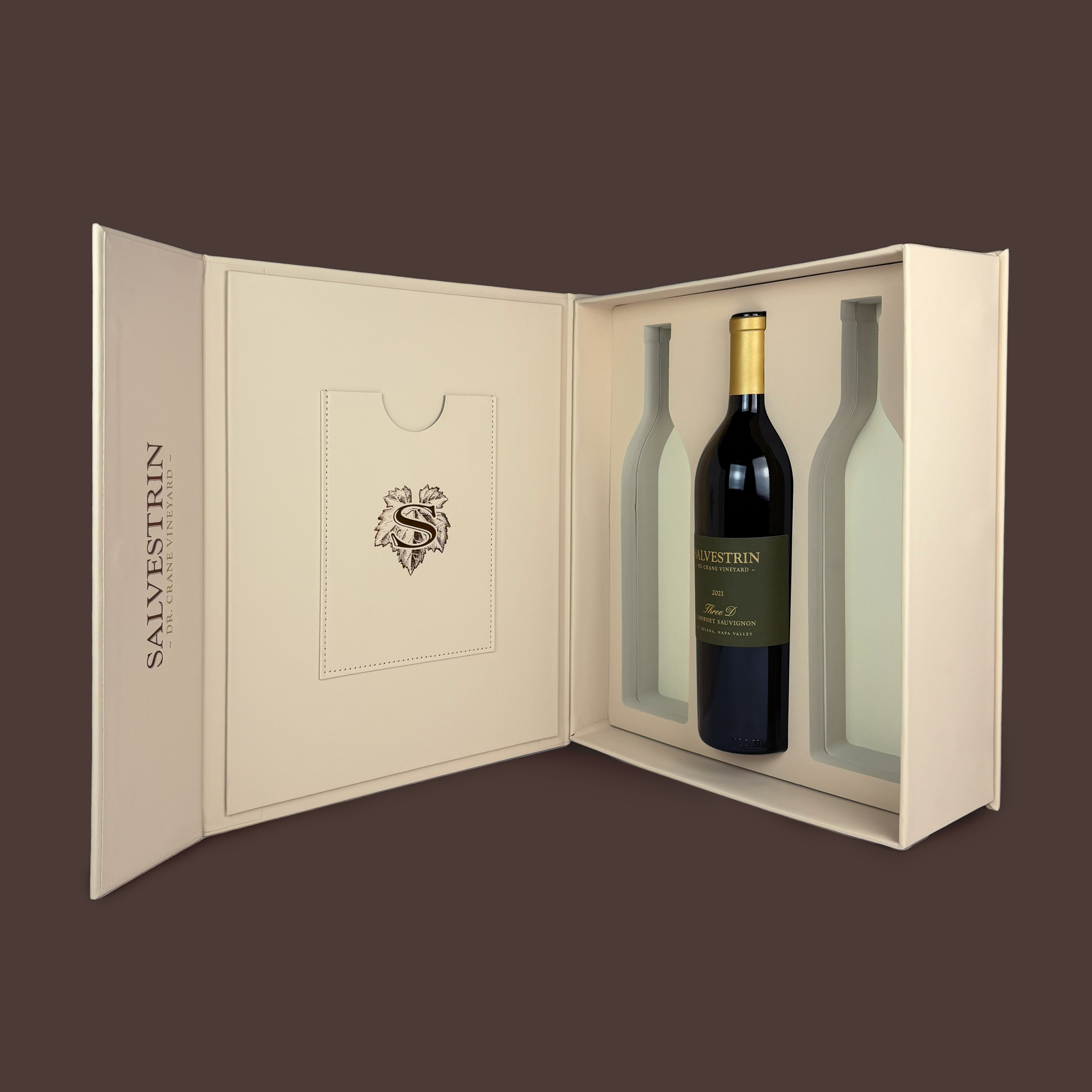 A 3-bottle gift box for holiday shipments. Leather wrap, magnetic closure, and a clever center insert for 2-bottle sends.