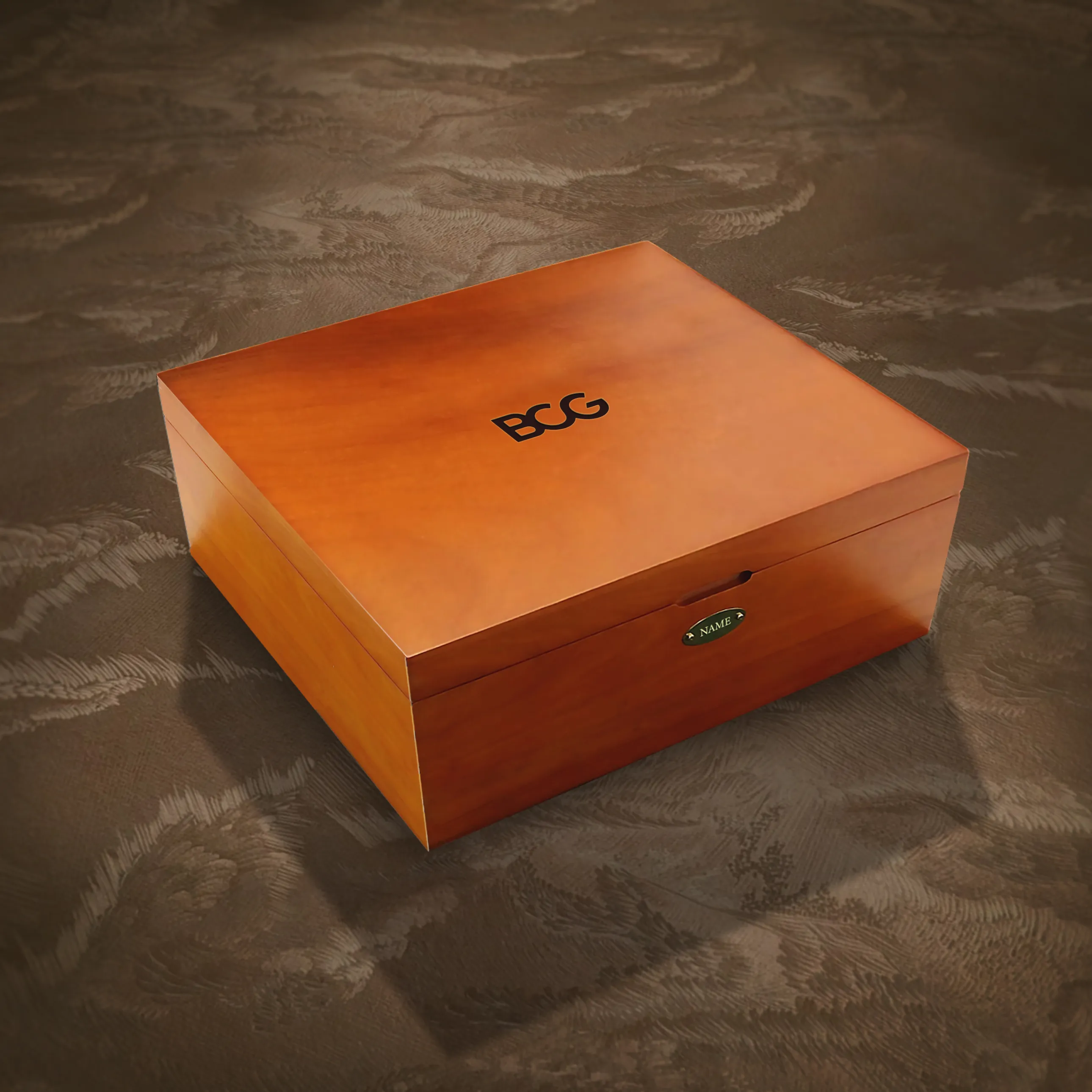 An executive gift box that travels well and looks even better. Wood, brass, and a suede-lined pocket for documents.